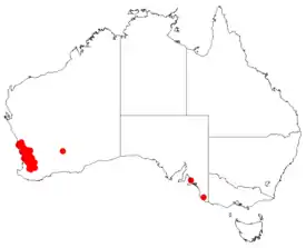 Эндемик Западной Австралии. Растёт в лесах и эвкалиптовых пустошах, в основном на хребте Дарлинг от близлежащих холмов Вонган до Наррогина в районе Эйвон-Уитбелт, песчаных равнинах Джералдтона, лесах Джаррах и прибрежной равнины Суон на юго-западе Западной Австралии[3][4].