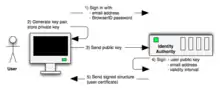 - Браузер в фоновом режиме загружает специальную страницу example.com для выдачи сертификатов, передаёт ему адрес почтового ящика alice@example.com и ассоциированный с ним открытый ключ, запрашивает подпись сертификата.