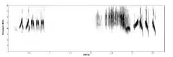Песня достаточно примитивная и обычно состоит из трёх частей, длящихся от 2,5 до 4 сек. Вначале птица издаёт короткую хриплую трельку «джир-титити», в которой громкость постепенно возрастает. После секундной паузы следует длинная довольно грубая трель, во второй половине переходящая в более размеренную третью фазу, что-то вроде «чьеер-чер-чер-чер-черр».[6] Мелодия может повторяться несколько раз подряд, последовательность частей нередко меняется местами. Финальная фаза может иметь различные варианты, как у географически изолированных популяций, так и у отдельных особей. Например, у птиц из Центральной Азии пение более однообразное — первая и последняя части состоят из идентичных звуков.[7]