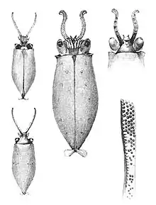 Мантия моллюска коническая и удлинённая с узким задним кончиком. Стенки мантии тонкие и кожистые. Аппарат, запирающий воронку, маленький овальный либо веретенообразный. Присутствует единственный хрящевой бугорок на краях мантии, хотя изредка может вовсе отсутствовать. Длинные и узкие плавники начинаются от 40 до 60% длины мантии, относительно далеко от наиболее широкой части тела. Они проходят вдоль задней части тела, на середине своей длины сливаются друг с другом и заканчиваются парой небольших лепестков[1][2][8]. Щупальца (руки) короткие либо средней длины, примерно от четверти до половины длины мантии. У взрослых самцов и самок третья пара рук самая длинная, за ней следуют вторая, первая и четвёртая пары (фромула длины: III> II> I> IV). Иногда четвёртая и первая пары могут иметь одинаковую или почти равную длину (формула длины: III> II> I = IV)[9]. Взрослые самцы могут иметь первую и вторую пару равной длины (но короче, чем третья пара), или первая пара может быть самой длинной из всех рук (формула длины: III> I = II> IV или I> III> II > IV). Все щупальца имеют два ряда чашеобразных или шаровидных присосок, в которых отсутствуют крючки[8]. Присоски в средней части третьей и второй пары рук значительно увеличены, превышая ширину рук[2].