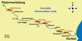 Трасса пробега проходит по дорогам южноафриканской провинции Квазулу-Натал. Направление движения меняется ежегодно; в зависимости от места старта пробег носит условное название «вверх» или «вниз». Пробег «вверх» стартует в Дурбане и финиширует в Питермарицбурге, пробег «вниз» стартует в Питермарицбурге и финиширует Дурбане. Несмотря на своё официальное название (The Comrades Marathon, дословно Марафон «Товарищи»), пробег является не классическим марафоном длиной 42,195 км, а соревнованиями на сверхмарафонскую дистанцию. Длина трассы меняется в зависимости от направления: при пробеге «вверх» она составляет 85—86 км, при пробеге «вниз» — 88—89 км. Дистанция проложена по гористой местности; суммарный набор высоты составляет порядка 1,8 км при движении по направлению «вверх», и 1,2 км при движении по направлению "вниз"[2]. Первая треть дистанции «вверх» проходит по длинному и крутому подъёму. Верхняя часть трассы расположена на плоскогорье, по которому проходят гребни, пересекающие маршрут. Бегуны преодолевают перевалы протяжённостью 500 — 5000 м, которые, при направлении движения «вверх», располагаются в следующем порядке: Коуи-Хилл, Филдз-Хилл (Field’s Hill), Ботас-Хилл, Инчанга и Полли-Шорттс[3]. На дистанции организовано более 50-ти пунктов питания[4].