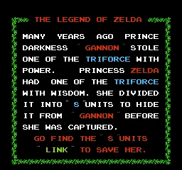 Сюжет игры The Legend of Zelda в очень сжатой форме описывается во вступлении к игре и куда более подробно — в сопровождавшем игру иллюстрированном руководстве пользователя. Действие игры разворачивается в вымышленном королевстве Хайрул (англ. Hyrule). Вторгшаяся в Хайрул армия могущественного принца Тьмы Ганона (англ. Ganon) ввергла королевство в хаос, сам Ганон захватил Трифорс Силы, магический артефакт, дарующий своему владельцу великую мощь. Принцесса Хайрула Зельда, владевшая другим артефактом, Трифорс Мудрости, разделила его на восемь фрагментов и спрятала их от Ганона в тайных подземельях королевства.