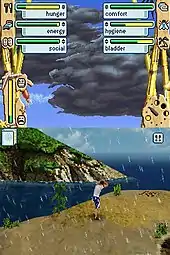 Верхняя часть экрана отображает статистику и инвентарь персонажа. Интерфейс также отображает текущие потребности персонажа. Самыми важными из них являются индикаторы голода и отдыха. Игрок должен убедится, что, у него всегда есть достаточный запас еды и место для сна[4]. Сим может взобраться на скалы с видом на океан, или же углубиться вглубь острова[5]. В игре реализована механика смены дневного и ночного времени суток[5].