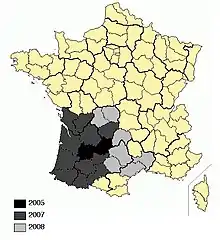 Вид, нативный для Китая и ставший инвазивным для Франции. В Европу он был завезен в 2004 году[1].