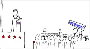 Википедия была также использована в качестве источника в журналистике[118], иногда без указания авторства, а также несколько журналистов были уволены за плагиат из Википедии[119][120][121]. В июле 2007 года Википедии был посвящён 30-минутный документальный фильм на BBC Radio 4[122]. Он утверждал, что количество ссылок на Википедию в популярной культуре таково, что этот термин является одним из группы избранных существительных XXI века, которые так узнаваемы (Google, Facebook, YouTube), что они больше не нуждаются в объяснениях и находятся на одном уровне с такими терминами XX века, как Hoovering или Coke. Существует много пародий на открытость Википедии с персонажами, вандализирующими или изменяющими статьи онлайн-энциклопедии. Примечательно, что комик Стивен Колберт пародировал Википедию или ссылался на Википедию в многочисленных эпизодах его шоу The Colbert Report и придумал соответствующий термин «wikiality»[123].