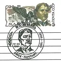 «135 лет со дня рождения М. Врубеля». На марке изображён демон летящий, 1991