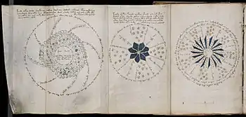 68 страница из рукописи Войнича. Это трёхстраничное вложение из манускрипта включает предположительно астрономическую схему