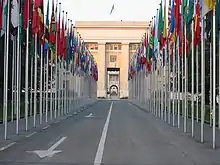 Флагштоки перед зданием Организации объединённых наций (ООН) в Женеве