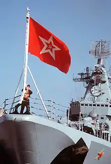 Гюйс-шток с гюйсом ВМФ СССР, на ракетном крейсере «Маршал Устинов»